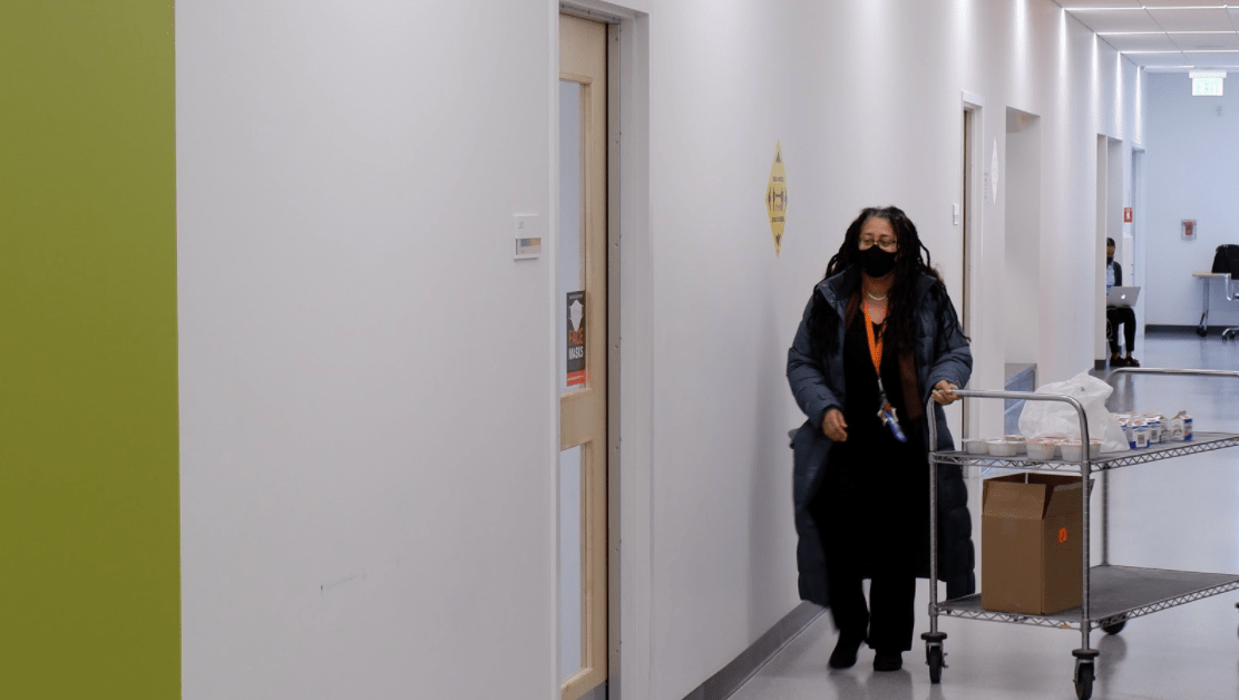 Principal Nicole Mack pitches in by delivering breakfast to every classroom on the first day of Hybrid learning.